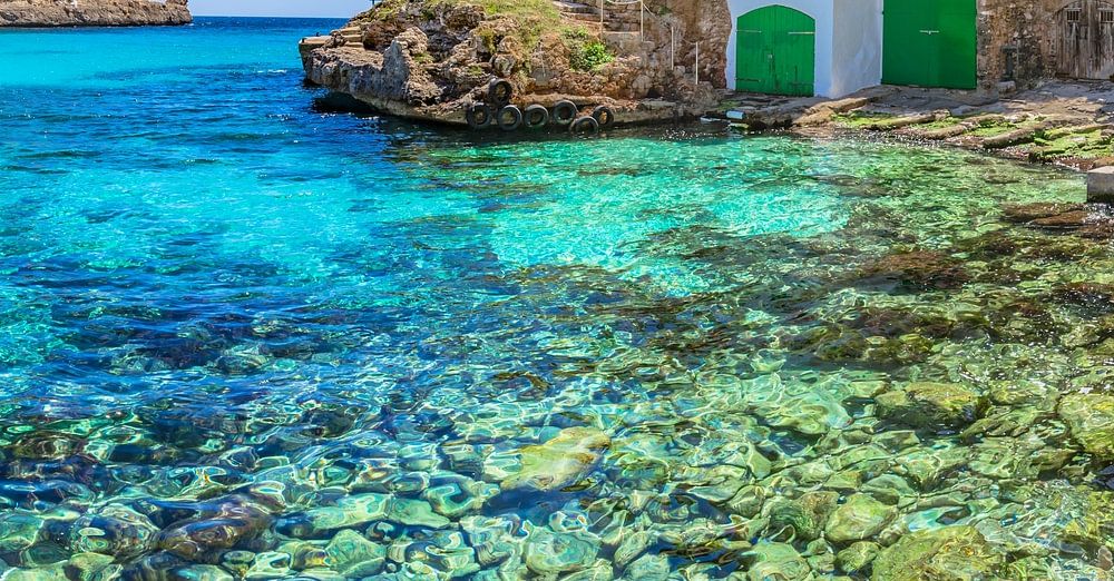 Mallorca, Spanien, Panoramablick auf Cala Santanyi Strandbucht, Mittelmeer. Alte Fischerhäuser.