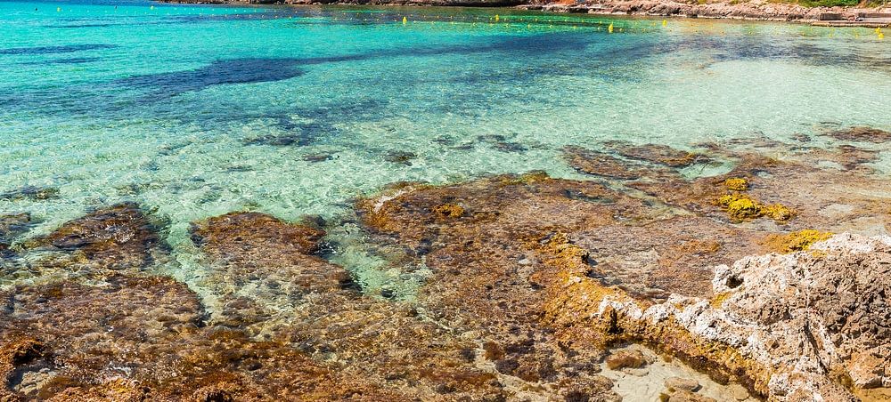 Sommerurlaub auf der Insel Mallorca, schöner Panoramablick auf Strandbucht mit Segelyachten, Spanien Mittelmeer, Mallorca, Balearen, Balearisches Meer, Mittelmeer, Spanien