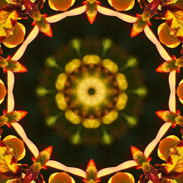 Mandala in dunkleren Farben, vorherrschend in gelb und dunkelgrün, aus einem reellen Bild entstanden.