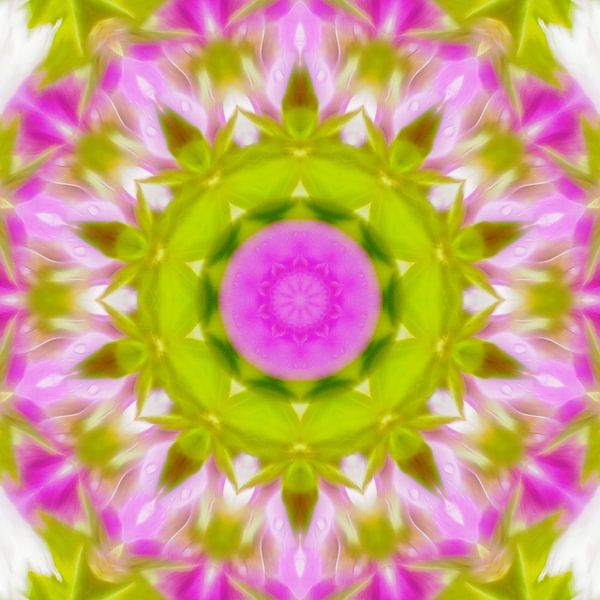 Mandala in sanften Farben, vorherrschend in rosa und grün aus einem reellen Bild entstanden.