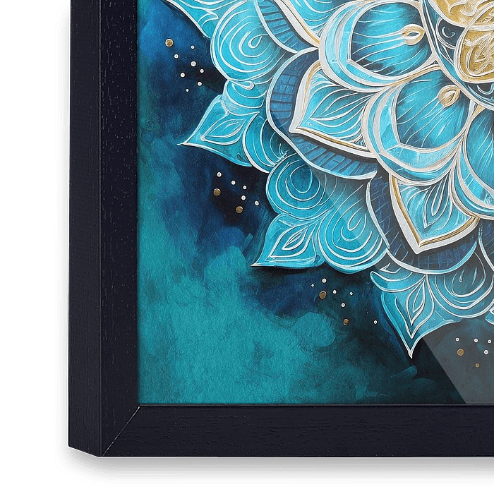 Abstraktes Mandala in Blau-, Türkis- und Grüntönen mit Goldakzent.
