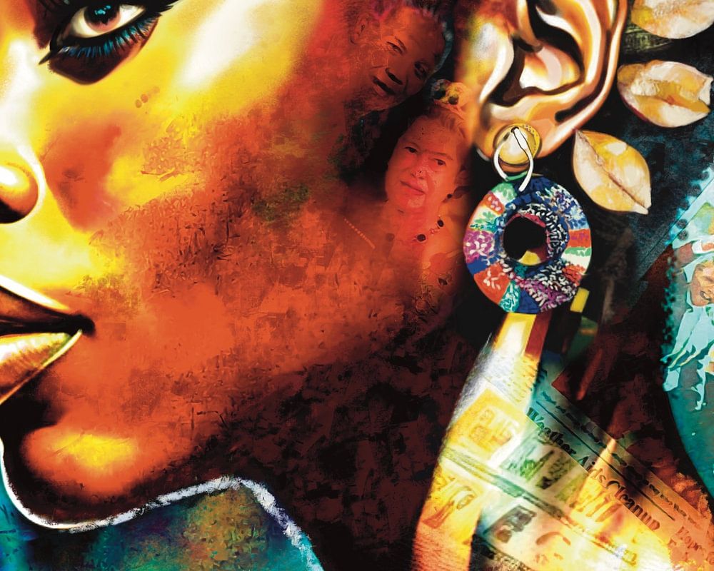 Gemischte Medienarbeit. Farbenfrohe Zeichnung, die mit digitalen Farbstiften und Pinseln bearbeitet wurde. Dann wurden digital bearbeitete Zeitungsstücke in die Zeichnung eingearbeitet. Seit einer Reise in den Senegal habe ich mehrere Werke zum Thema Afrika geschaffen.