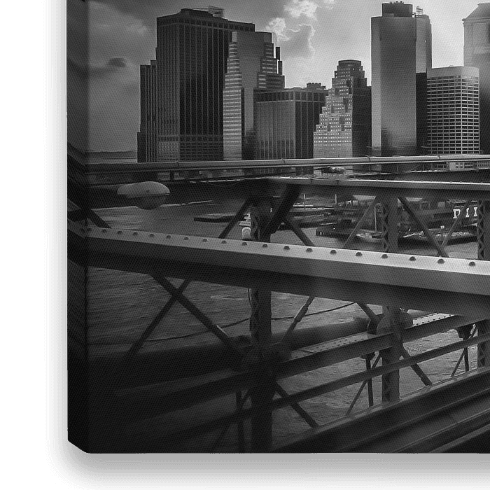Auf der Brooklyn Bridge mit Blick auf Manhattan, NYC. Sonnenstrahlen treten hinter einer Wolke hervor. Klassiche urbane schwarz weiß Szene.
