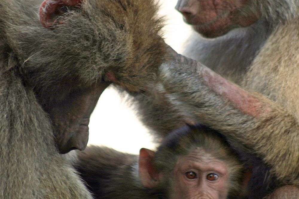 Mantelbaviaanfamilie aan het vlooien. Vond het kleintje zo lief!