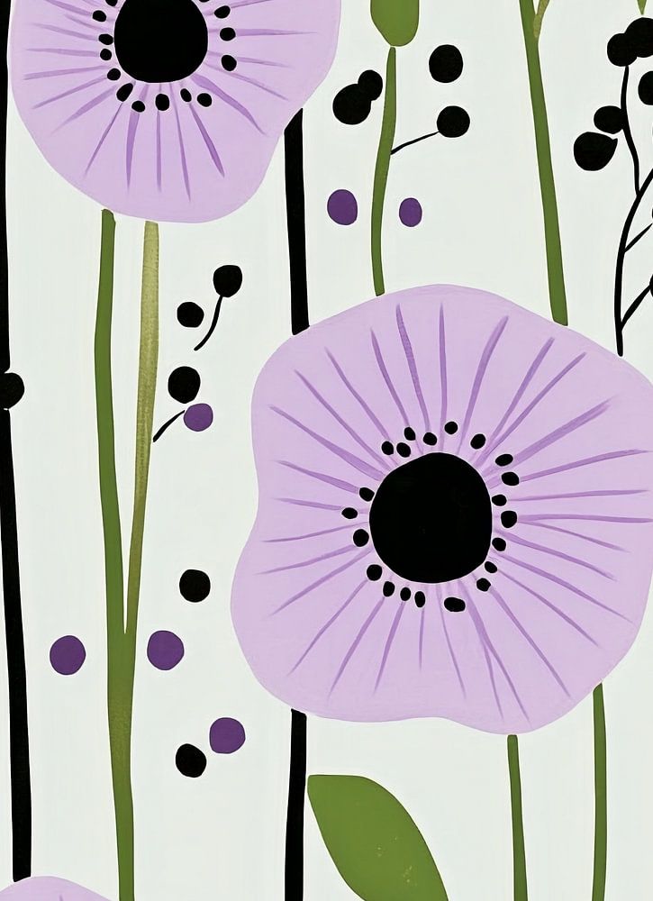 Verleihen Sie Ihrer Einrichtung einen Hauch von Eleganz mit diesem Kunstwerk, das vom kultigen Marimekko-Stil inspiriert ist. Die hellvioletten Blumen mit schwarzen Akzenten bilden ein verspieltes und raffiniertes Muster, das jede Wand zum Leben erweckt.