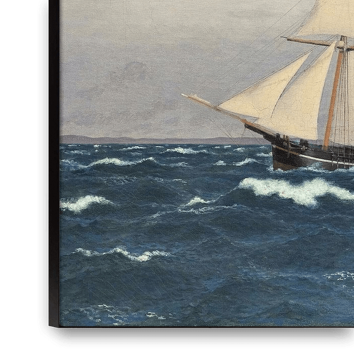 Ein Segelschiff ist in das Kattegat hinausgefahren. Das windige Wetter füllt seine Segel, während die schaukelnden Wellen gegen den Schiffsrumpf schlagen. Am Horizont sind die Insel Hjelm und die Küste Jütlands zu erkennen. C.W. Eckersberg entwickelte schon früh ein Interesse an der Marinemalerei.