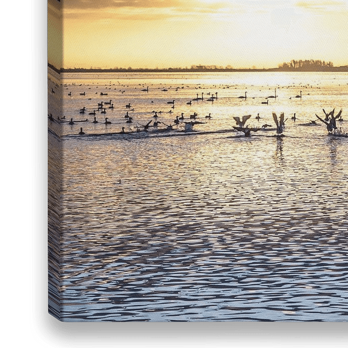 Gänse fliegen in der aufgehenden Sonne am Markermeer auf.