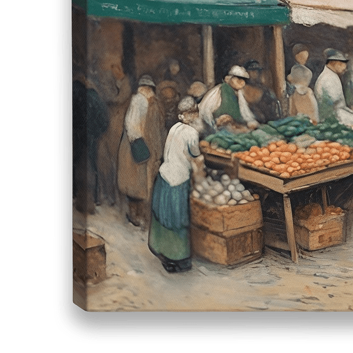 Lebensmittelmarkt in einem französischen Dorf im Stil von Caille Pissarro.