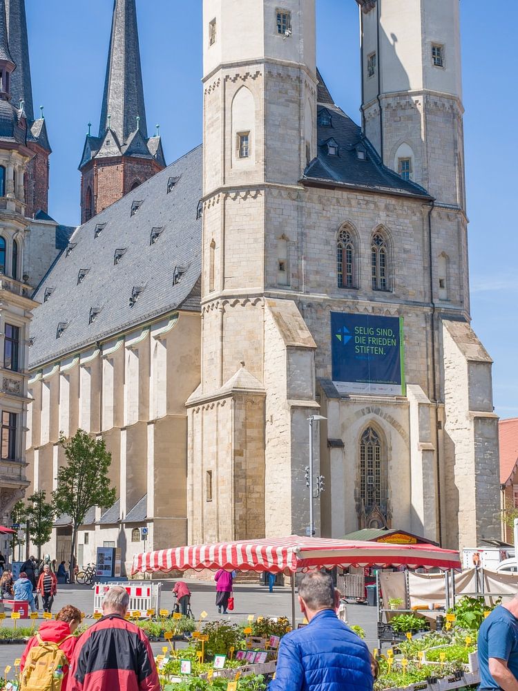 Mit ihrem dreischiffigen Hallenbau zählt sie zu den bedeutendsten spätgotischen Kirchen Mitteldeutschlands. In der Kirche befindet sich das Taufbecken, an dem Georg-Friedrich Händel getauft wurde. Die Marktkirche zählt zu den bedeutendsten Bauten der Spätgotik aus der Zeit der Renaissance in Mitteldeutschland. Ihre vier Türme bilden zusammen mit dem Roten Turm das Wahrzeichen der Saalestadt.