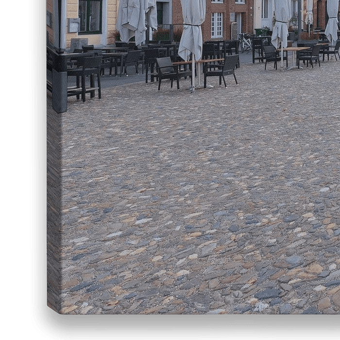 Das Foto zeigt den Marktplatz der Stadt Kalkar. Neben dem mittelalterlichen Rathaus ist ein Teil der altstädtischen Architektur der niederrheinischen Stadt erhalten. Am rechten Bildrand ist die über 470 Jahre alte Gerichtslinde zu sehen.