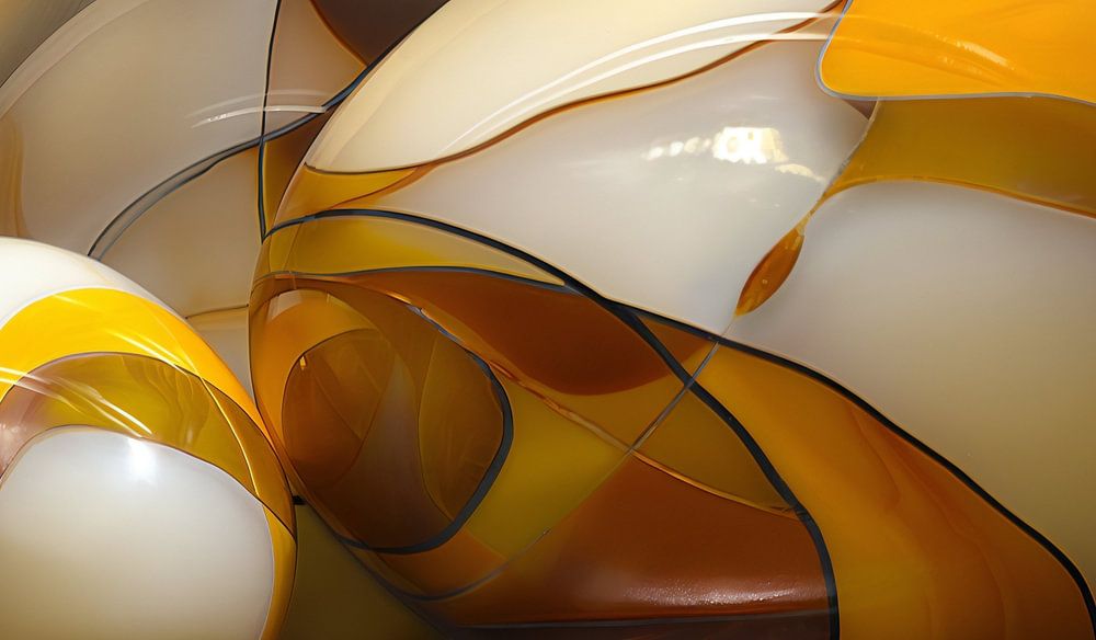 Glänzende Steineier mit Marmorstruktur in warmen Erdtönen mit Ockergelb, Cremeweiß und Orange auf einem braunen abstrakten Hintergrund.