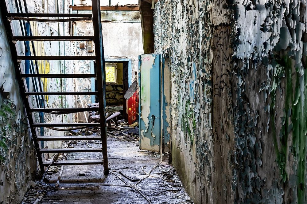 Maroder Korridor mit Treppe nach oben - Lost Place Alter Flugplatz Rangsdorf.