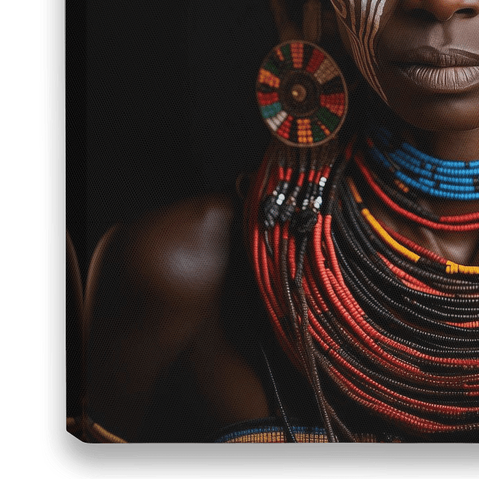 In diesem ergreifenden Stillleben wird die Kraft und Schönheit einer afrikanischen Massai-Frau zum Leben erweckt. Ihr durchdringender Blick spiegelt die Tiefe ihrer Erfahrungen und den Stolz auf ihr Erbe wider. Die leuchtenden Farben ihrer traditionellen Massai-Kleidung bilden einen lebhaften Kontrast zum schwarzen…