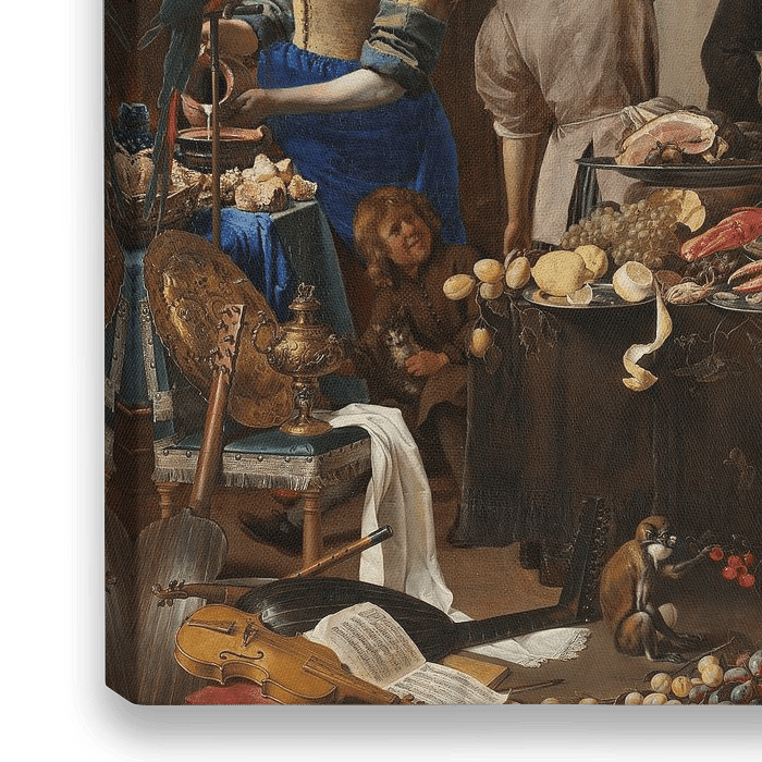 Mashup von mehreren berühmten klassischen Gemälden. Die Milchmagd von Vermeer, Fütterung des Papageis von Jan Steen und ein Stillleben von Melchior d'Hoendecoeter.