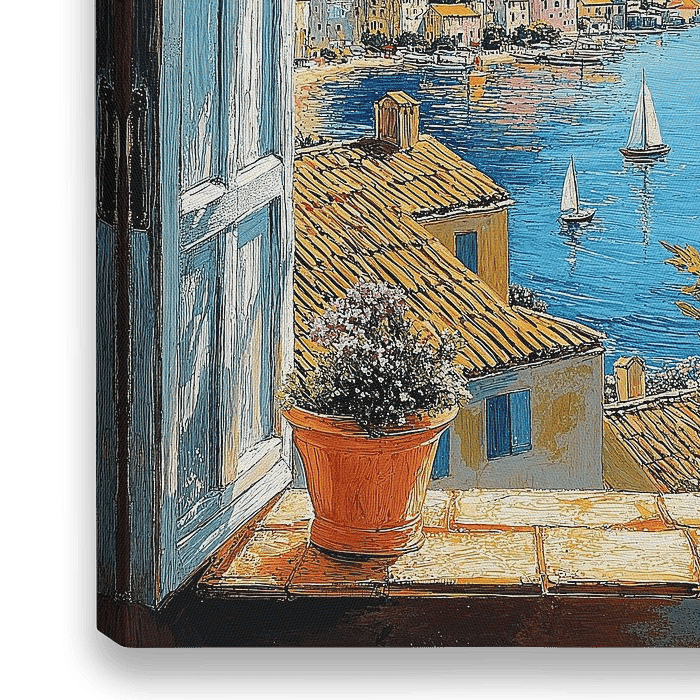 Bestelle diese Malerei Matisse inspiriert Open Window See von Niklas Maximilian als Reproduktion auf Leinwand, Alu-Dibond, als Poster, Fototapete oder Acrylglasbild.