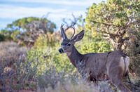 Foto eines Maultierhirsches (Mule Deer), der an einem sonnigen Tag zum Fotografen im Arches-Nationalpark in den Vereinigten Staaten aufschaut.