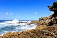 Brandung an den Klippen von Ile aux Fouquets eine kleine, unbewohnte Felseninsel die in der Grand Port Bay vor der Südostküste der Hauptinsel Mauritius liegt.