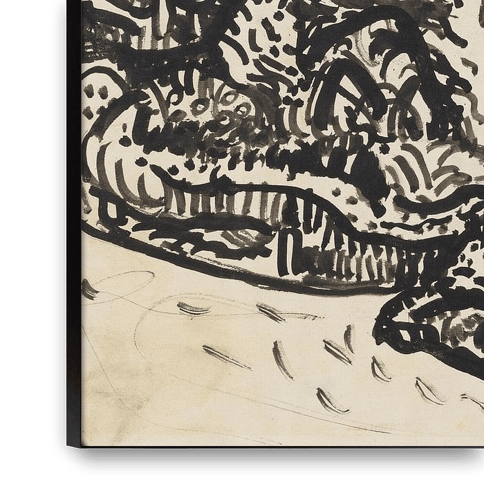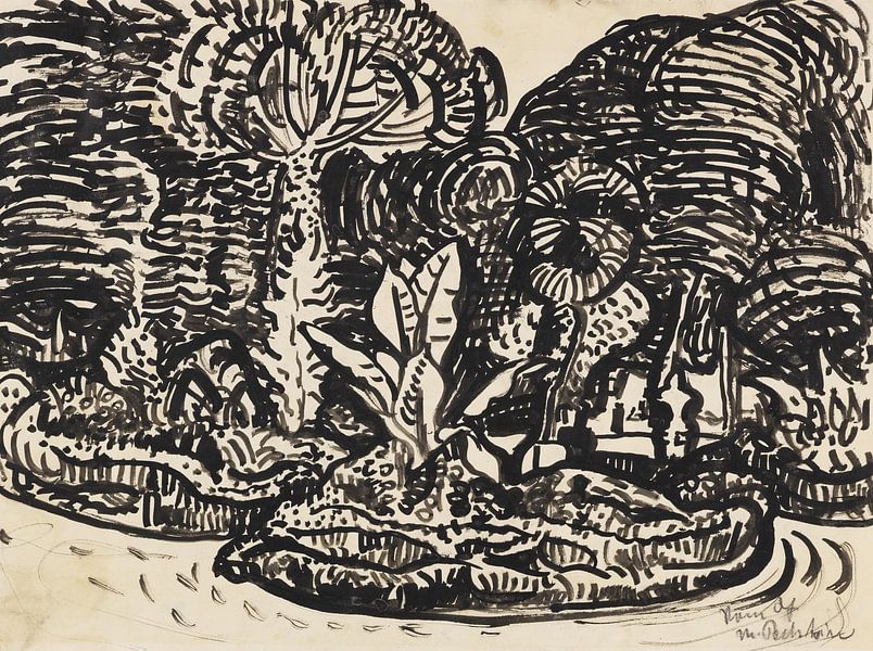 Een expressieve, bijna abstracte inkttekening met een weelderige, exotische tuin of plantenzee: grote, golvende planten, palmen, varens en bladeren vullen het gehele vlak met dichte, wervelende patronen en cirkelvormige vormen. De compositie is symmetrisch en organisch, met een centraal motief van hoge, uitwaaierende bladeren of bomen…