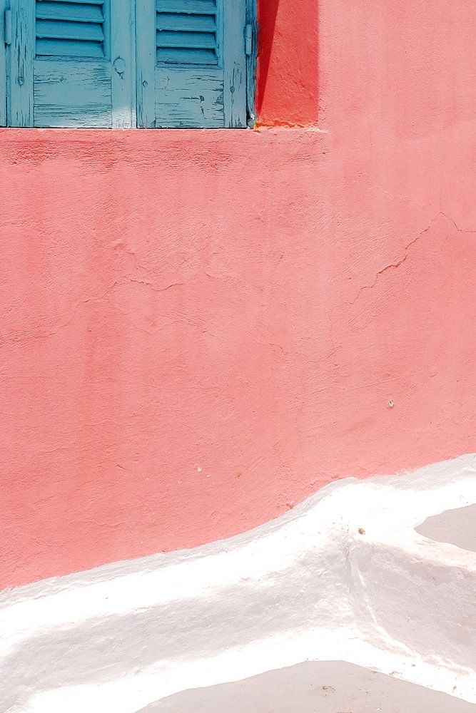 Dieses farbenfrohe Foto fängt den Charme von Karpathos in seiner reinsten Form ein. Die leuchtend rosafarbene Wand mit den hellblauen Holzfensterläden bildet einen auffälligen Farbkontrast, der sofort ins Auge fällt. Die organisch geformten weißen Stufen führen dezent nach oben und verleihen dem Bild einen natürlichen Fluss. Die verwitterten Fensterläden und kleinen Risse in der Wand erzählen Geschichten von Sonne, Wind und Zeit - genau das, was dieses Bild so charaktervoll macht.