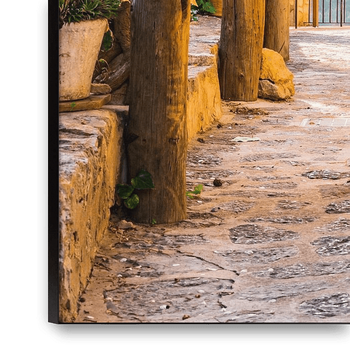 Bestelle dieses Blumen-Wandbild Mediterrane Terrasse mit schönen Topfpflanzen und idyllischem Sonnenuntergangslicht von Alex Winter als Reproduktion auf Leinwand, Alu-Dibond, als Poster, Fototapete oder Acrylglasbild.