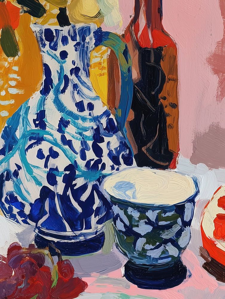 Dieses lebhafte Stillleben voller Farben und Strukturen zeigt einen sonnendurchfluteten Tisch mit gemusterten Keramiken, reifen Früchten und einer Vase mit blühenden Blumen. Die Komposition verbindet klassische Stilllebenelemente mit modernen, ausdrucksstarken Pinselstrichen. Im Stil von Matisse