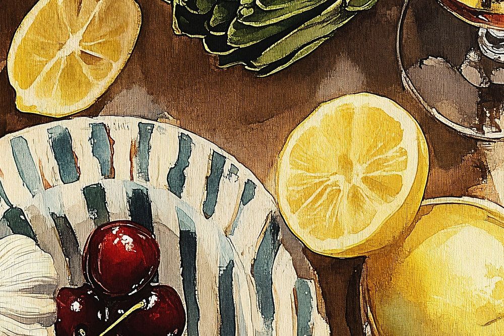 Eine attraktive Komposition, die die Essenz mediterraner Küche einfängt, mit reifen Kirschen auf einem gestreiften Teller, saftigen Zitronen, einer frischen Artischocke und einem Glas rubinroten Wein. Das Kunstwerk strahlt durch die Verwendung sanfter Brauntöne und dramatischem Licht Wärme aus und erinnert an ein klassisches Stillleben in moderner Interpretation.