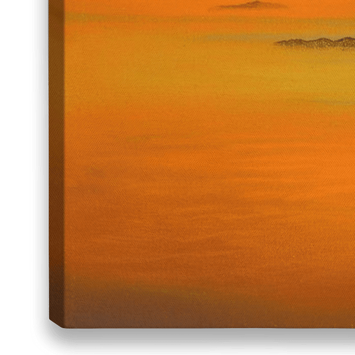 Das vogestellte Gemälde präsentiert sich in einem großzügigen Breitbildformat und fängt die Schönheit einer abgelegenen Insel inmitten eines weitläufigen Ozeans auf eindrucksvolle Weise ein. Die Szene besticht durch eine atemberaubende Harmonie, sowohl in Bezug auf die Farben als auch auf die gelassene Atmosphäre, die sie…