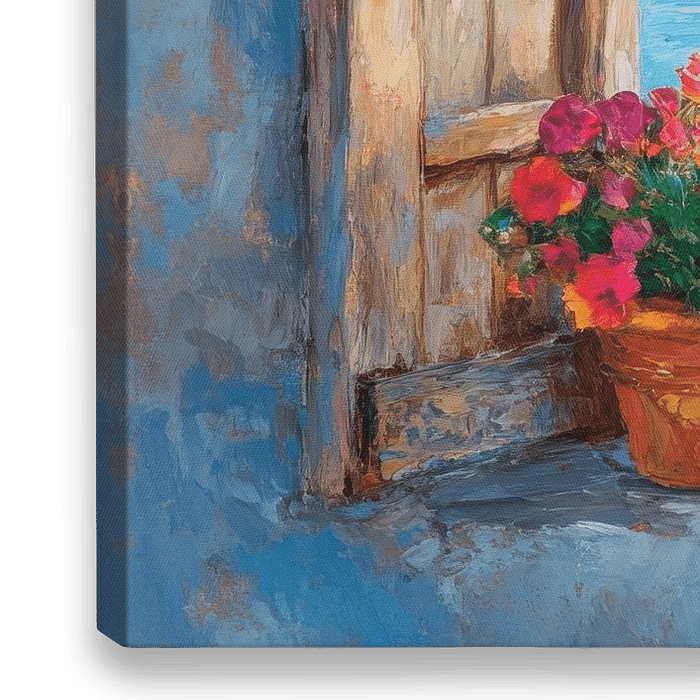 Ein Blick durch die offenen Fenster, umrahmt von üppigem Grün, enthüllt ein strahlendes Meer unter einem blauen Himmel. Sanfte Segelboote gleiten über die Wellen, während lebendige Blumen in einem Tontopf für einen Hauch von Farbe und Wärme sorgen. Hier verschmelzen Natur und Küstenidylle zu einem traumhaften Panorama der Freiheit.