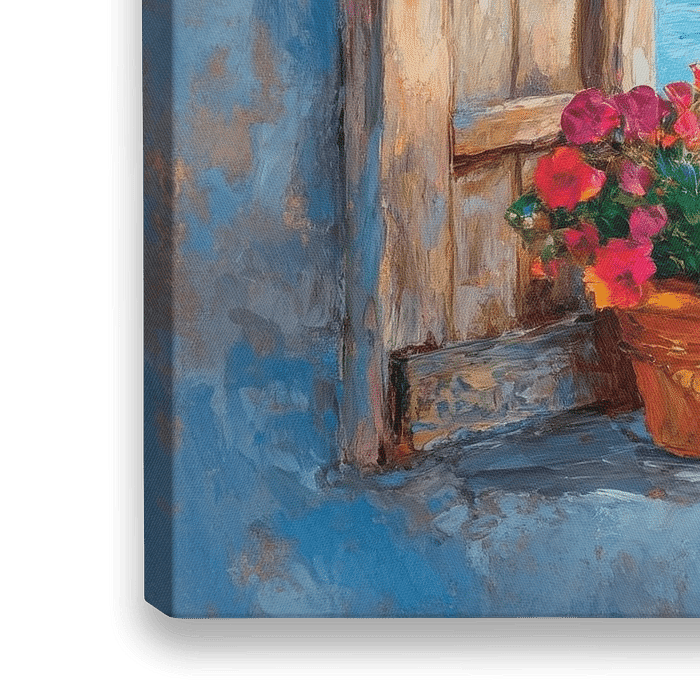 Ein Blick durch die offenen Fenster, umrahmt von üppigem Grün, enthüllt ein strahlendes Meer unter einem blauen Himmel. Sanfte Segelboote gleiten über die Wellen, während lebendige Blumen in einem Tontopf für einen Hauch von Farbe und Wärme sorgen. Hier verschmelzen Natur und Küstenidylle zu einem traumhaften Panorama der Freiheit.