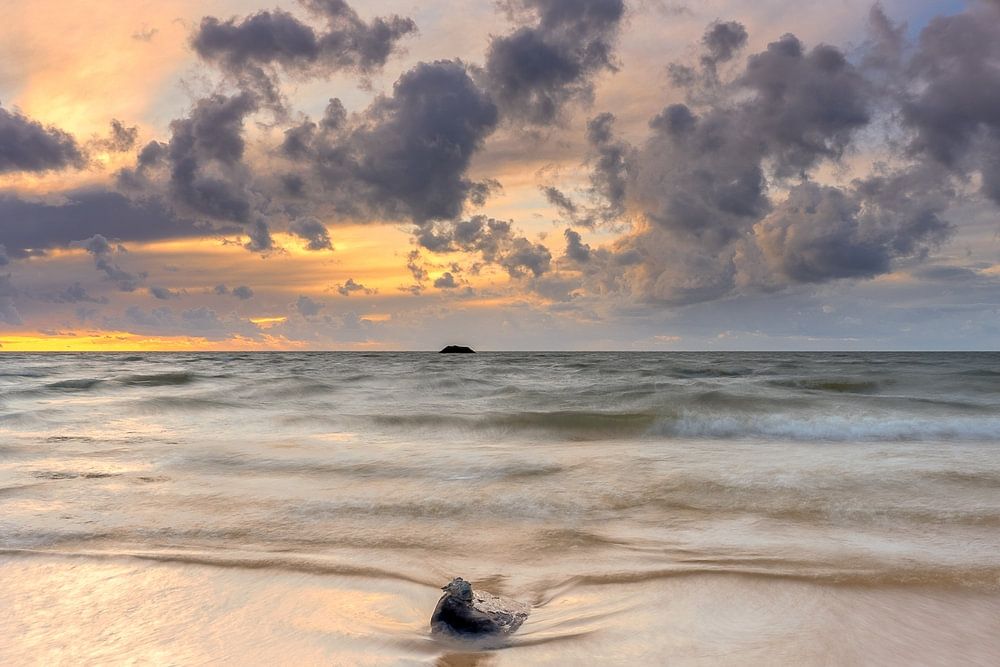 Meerblick mit einem schönen Spiel von Himmel, Wolken und Licht. Ein ruhiges Meer mit einem Stück Treibholz im Vordergrund. Farben von Blau bis Gelb und Orange, die sich zu einem schönen Landschaftsfoto zusammenfügen.