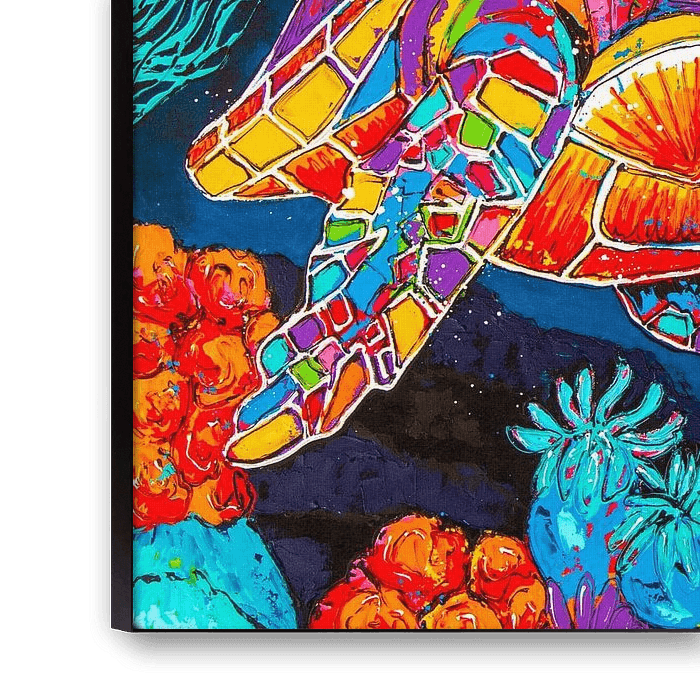 Dieses lebhafte Gemälde zeigt zwei Meeresschildkröten in liebevoller Umarmung, umgeben von bunten Korallen und verspielten kleinen Fischen.
