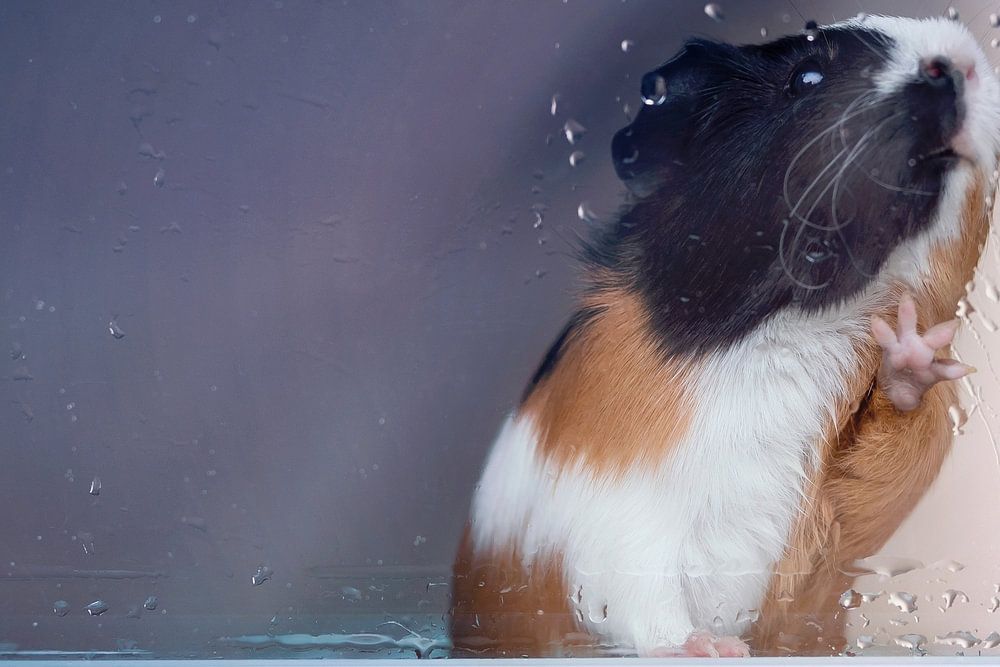 Mies, das Meerschweinchen, an einem regnerischen Tag am Fenster. Ihre Pfote am Fenster vervollständigt die Stimmung des Bildes.