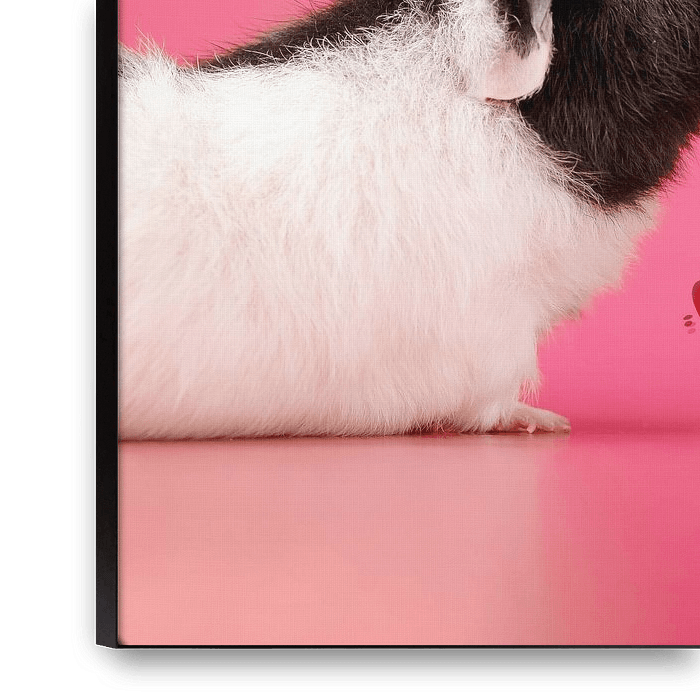 Liebe liegt in der Luft - und dieses Meerschweinchen spürt sie ganz genau! Bringen Sie Wärme, Verspieltheit und eine große Portion Liebe in Ihre Innenräume mit diesem charmanten Fotodruck eines liebenswerten schwarz-weißen Meerschweinchens. Das Meerschweinchen ist vor einem leuchtend rosa Hintergrund fotografiert, umgeben von…