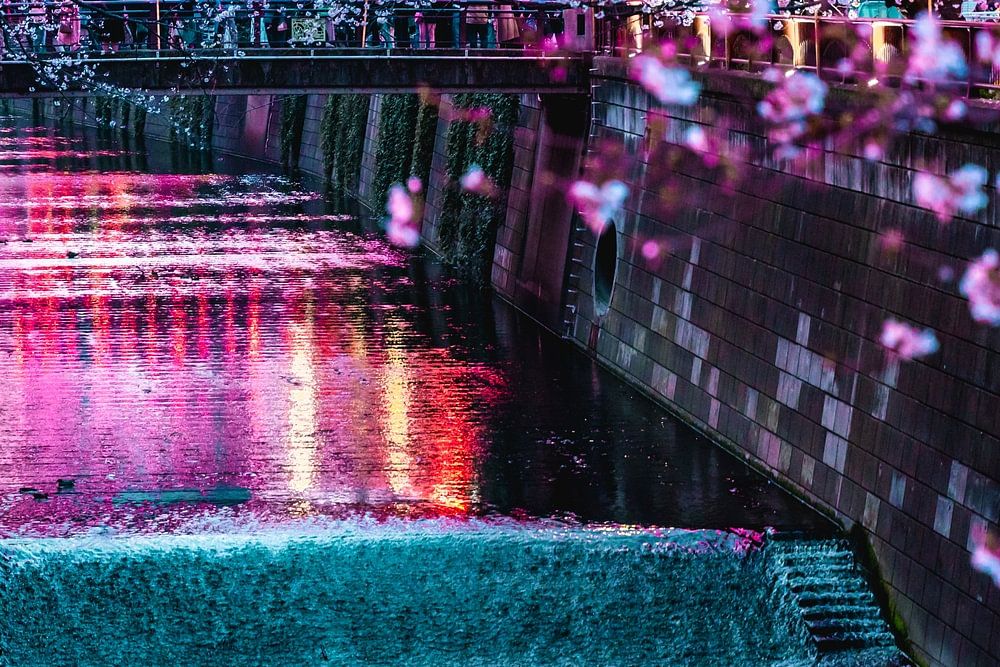 Meguro-Fluss mit von verschiedenen Laternen beleuchteten Kirschblüten im Zentrum von Tokio in Japan. Während der Sakura-Saison im Frühjahr.