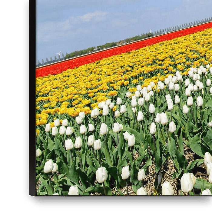 Bestelle dieses Landschafts-Wandbild Mehrere Farben von Tulpen wachsen in einem Feld während der Frühlingszeit von Sjoerd van der Wal Fotografie als Reproduktion auf Leinwand, Alu-Dibond, als Poster, Fototapete oder Acrylglasbild.