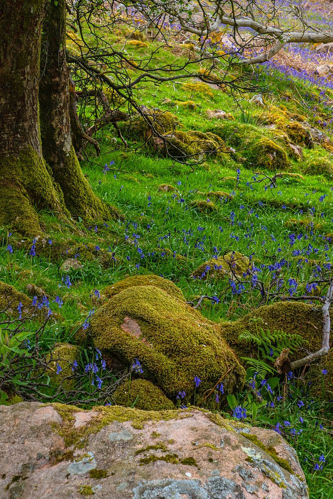 Alle Arten von Wildblumen, einschließlich Waldhyazinthen und Blüten auf den Bäumen im Wald in der Nähe des Lake Buttermere in Cumbria, England.
