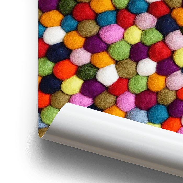 Eine lebendige Oberfläche, die aus dicht gepackten, bunten Filzkugeln in verschiedenen Farbtönen besteht. Die Komposition schafft ein visuell auffälliges und strukturiertes Muster, das verspielt und einladend wirkt.