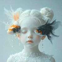 Ein hübsches Mädchen mit blasser, porzellanartiger Haut und geschlossenen Augen träumt ihren Traum. Ihr Gesichtsausdruck ist heiter und ruhig, unschuldig und rein. Die Fische, die um ihren Kopf schweben, symbolisieren ihre Gedanken, Ideen, die umherwirbeln. Die hellen und weißen Farben symbolisieren ihre Unschuld und Reinheit, das Bild…