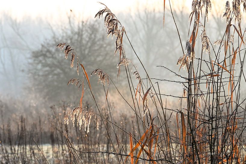 Nahaufnahme von Gräsern im Dunst bei Meinerswijk in Arnheim, Gelderland. Die Sonne ist gerade aufgegangen und der Himmel färbt sich golden.