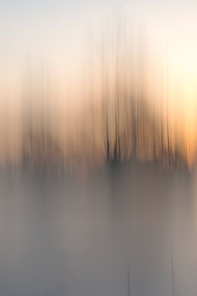 ICM oder absichtliche Kamerabewegung von einigen Bäumen im Auenpark Meinerswijk in Arnheim, Gelderland. Die Sonne geht auf und färbt den Himmel in ein schönes Orange.