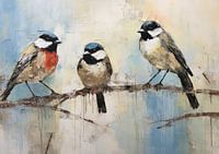 Meisen-Gemälde | Rustikale Meisen – Drei charmante Vögelchen, zweifellos Meisen, posieren auf einem Ast vor einem sanften blau-elfenbeinfarbenen Hintergrund, der rustikalen Charme versprüht. Mit ihrem flauschigen Gefieder in Schwarz, Weiß und einem verspielten Hauch von Rot bringen sie Lebendigkeit in die locker aufgetragenen,…
