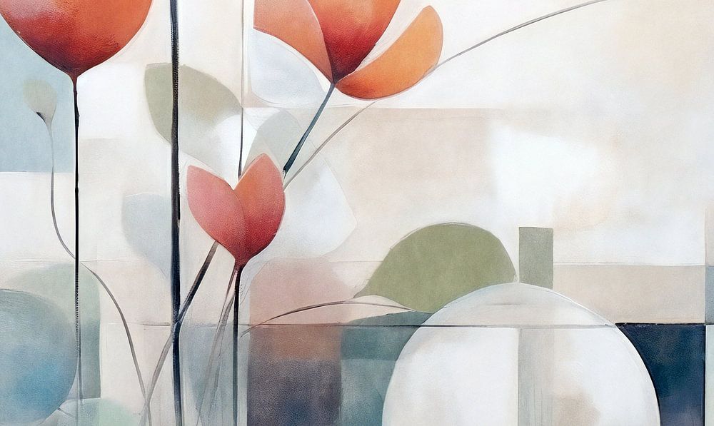 Abstrakte Illustration im Collage-Stil mit Blumen, Linien und runden und kubistischen Formen. Mischtechnik auf Papier in sanften Pastelltönen mit roter Akzentfarbe.