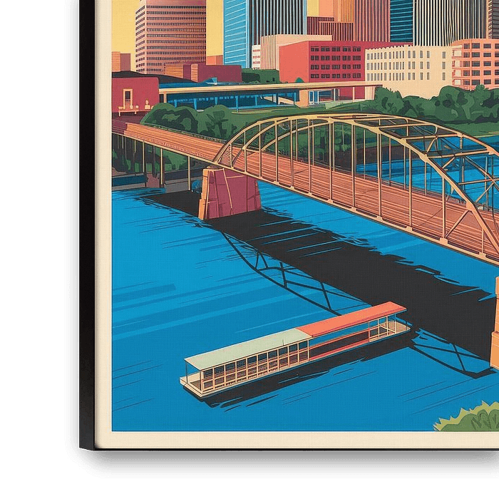Lebendige Farben und die markante Silhouette von Memphis laden zum Träumen ein. Die strahlende Sonne, der ruhige Fluss und die urbanen Elemente strahlen eine einladende Atmosphäre aus. Dieses Kunstwerk eignet sich perfekt für das Wohnzimmer, wo es Gespräche anregt und das Gefühl von Musik und Kultur ausstrahlt.