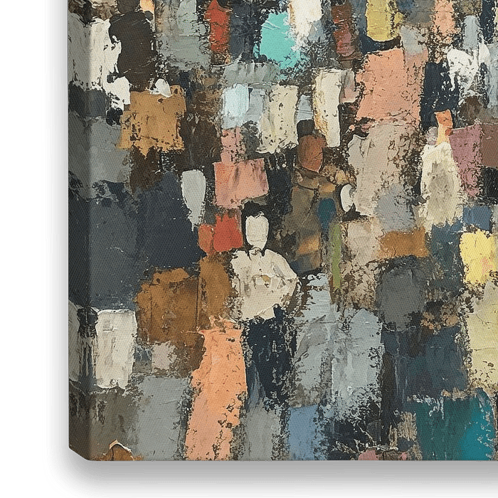 Menschen abstrakt - Dieses abstrakte Gemälde zeigt eine große Gruppe von Menschen in verschiedenen Farben, mit erkennbaren Figuren, die sich in vage Formen mischen, was ein lebendiges und dynamisches Aussehen ergibt.