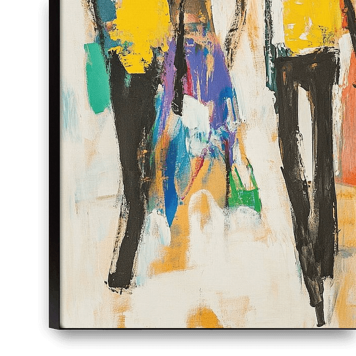 Menschen in leuchtenden Farben | Menschen in leuchtenden Farben - Dieses abstrakte Gemälde zeigt vier Menschen in leuchtenden Farben wie Gelb, Rot, Grün und Blau, die sich mit schlanken schwarzen Formen zu einer dynamischen Komposition zusammenfügen.