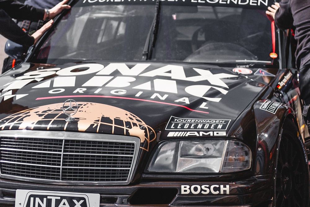 Ein wahrhaft kultiges Auto aus der deutschen DTM-Serie, ein schönes Szenario, bei dem das Auto von der Crew in die Garage geschoben wird.