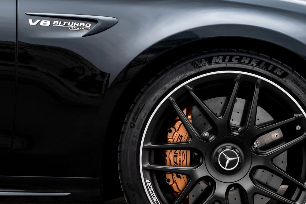 Ein hartes Bild mit Seitenansicht des brutalen Mercedes E-63.S AMG V8 Biturbo 4matic. Dieser Mercedes hat eine schwarze Farbe mit gold/gelben Bremssätteln und wurde in einem Industriegebiet fotografiert. Mögen Sie raue, harte Autos? Dann ist dieses Bild für Sie!
