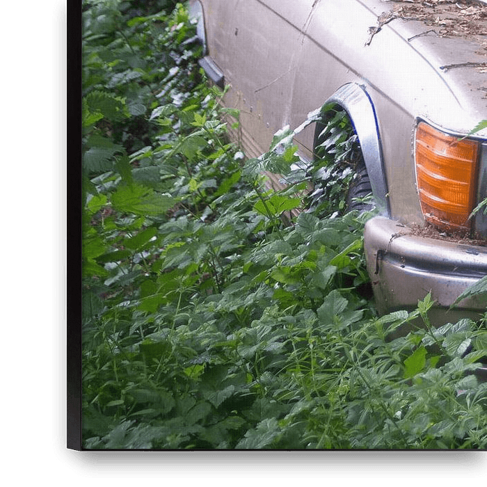 Dies ist ein Bild von einem Linkshänder Mercedes irgendwo in einem Wald. Das Auto war von anderen Wracks umgeben, die noch schlimmer waren.