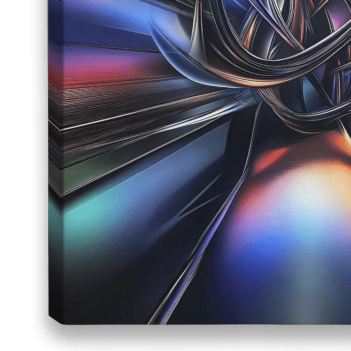 Dieses Werk zeigt einen abstrakten, fließenden Tanz aus Licht und Schatten, bei dem metallische Formen durch einen Raum aus verschiedenen Farben zu schweben scheinen. Die schimmernden, verschlungenen Linien und Formen rufen ein Gefühl der Bewegung hervor und verleihen dem Werk eine futuristische und dynamische Note.