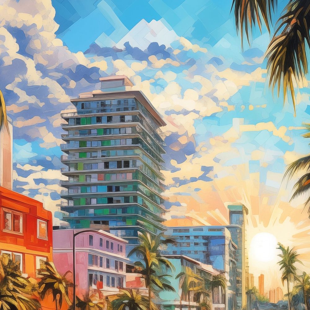 Dieses Miami Beach Downtown Gemälde erweckt die pulsierende Atmosphäre von Miami in einem stilvollen und künstlerischen Bild zum Leben. Das Bild zeigt einen farbenfrohen Eindruck der Innenstadt von Miami Beach, wo moderne Architektur, Palmen und tropisches Stadtleben aufeinandertreffen. Das Werk fängt die Essenz von Sonnenschein, Energie und Bewegung ein, eingefangen in einer künstlerischen Komposition, die sowohl dynamisch als auch ausgewogen wirkt.